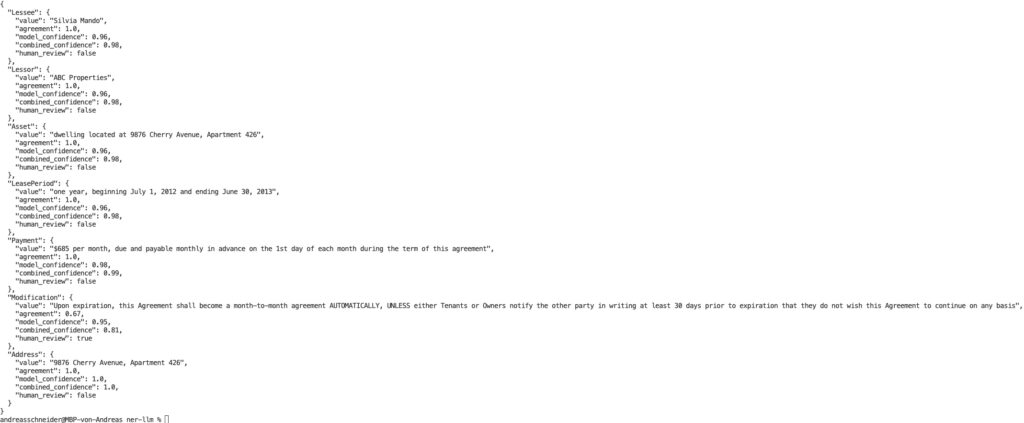Overall, the model consistently extracted each entity correctly. In some cases, it regenerated the value instead of copying it directly from the text – despite the extraction rules defined in the prompt template – but the values themselves were still accurate. It reliably identified Lessor, Lessee, Address, and Asset, although sometimes it added minor extra information (e.g., appending the address to the Asset entity). The combined confidence scores for these entities were consistently between 0.95 and 0.99, well above the manual threshold of 0.90, meaning no human review was required.